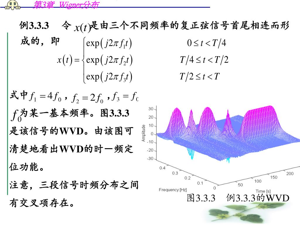例3.3.3 令 是由三个不同频率的复正弦信号首尾相连而形成的,即 • 式中 , , 。 • 为某一基本频率。图3.3.3 • 是该信号的WVD。由该图可 • 清楚地看出WVD的时-频定 • 位功能。 • 注意,三段信号时频分布之间 • 有交叉项存在。 图3.3.3 例3.3.3的WVD