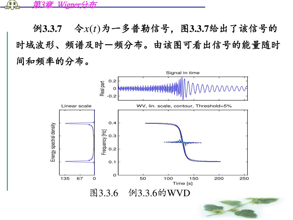 例3.3.7 令 为一多普勒信号,图3.3.7给出了该信号的 • 时域波形、频谱及时-频分布。由该图可看出信号的能量随时 • 间和频率的分布。 • 图3.3.6 例3.3.6的WVD