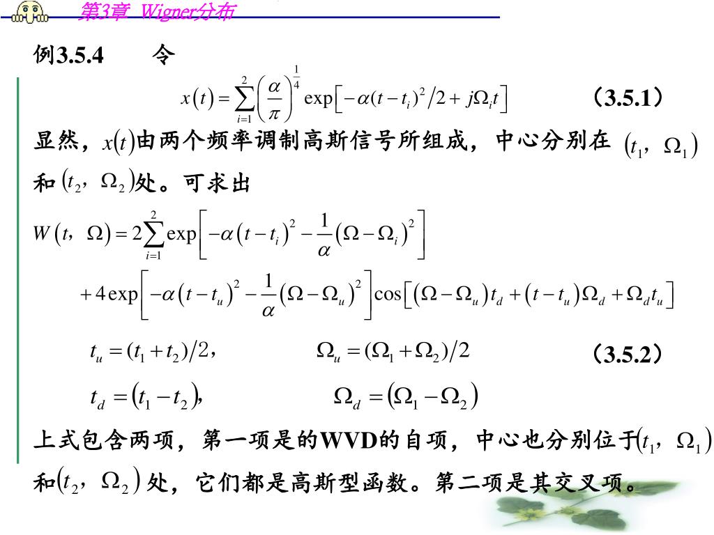 例3.5.4 令 • (3.5.1) • 显然, 由两个频率调制高斯信号所组成,中心分别在 • 和 处。可求出 • (3.5.2) • 上式包含两项,第一项是的WVD的自项,中心也分别位于 • 和 处,它们都是高斯型函数。第二项是其交叉项。