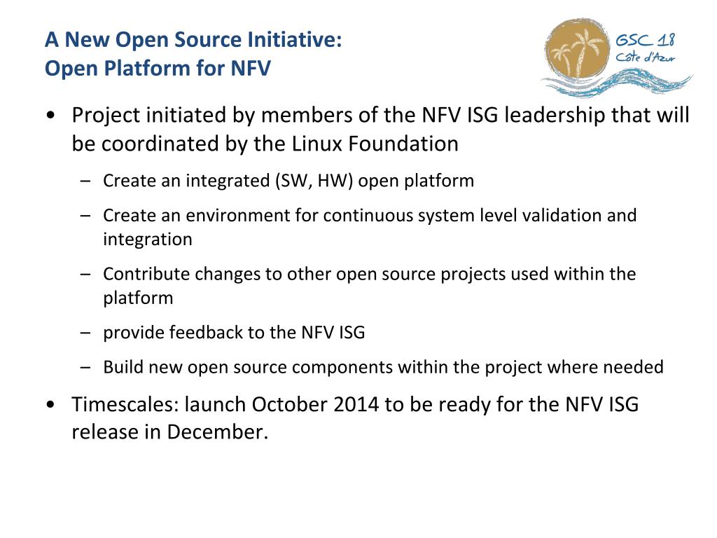 A New Open Source Initiative:Open Platform for NFV • Project initiated by members of the NFV ISG leadership that will be coordinated by the Linux Foundation • Create an integrated (SW, HW) open platform • Create an environment for continuous system level validation and integration • Contribute changes to other open source projects used within the platform • provide feedback to the NFV ISG • Build new open source components within the project where needed • Timescales: launch October 2014 to be ready for the NFV ISG release in December.
