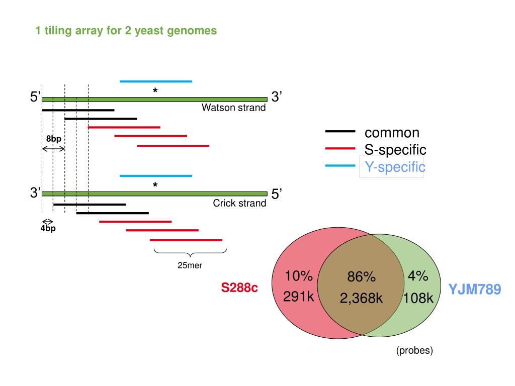 1 tiling array for 2 yeast genomes common S-specific Y-specific * 5’ 3’ Watson strand 8bp * 3’ 5’ Crick strand 4bp 25mer 10% 4% 86% S288c YJM789 291k 2,368k 108k (probes)