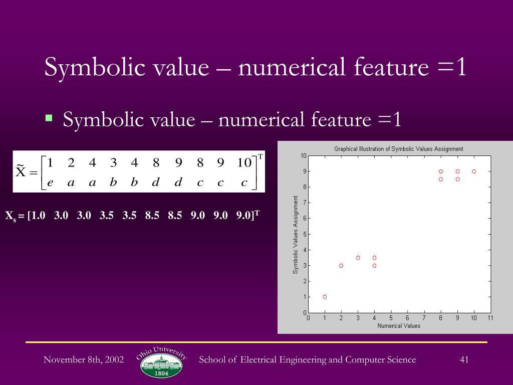 Symbolic value – numerical feature =1 • Symbolic value – numerical feature =1 Xs = [1.0 3.0 3.0 3.5 3.5 8.5 8.5 9.0 9.0 9.0]T School of Electrical Engineering and Computer Science