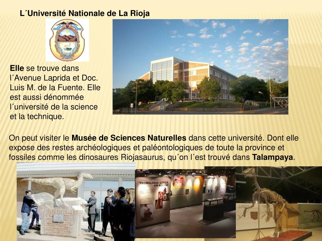 L´UniversitéNationaledeLaRioja Ellese trouve dans l´Avenue Laprida et Doc. Luis M. de la Fuente. Elle est aussi dénommée l´université de la science et la technique. On peut visiter le MuséedeSciencesNaturelles dans cette université. Dont elle expose des restes archéologiques et paléontologiques de toute la province et fossiles comme les dinosaures Riojasaurus, qu´on l´est trouvé dans Talampaya.