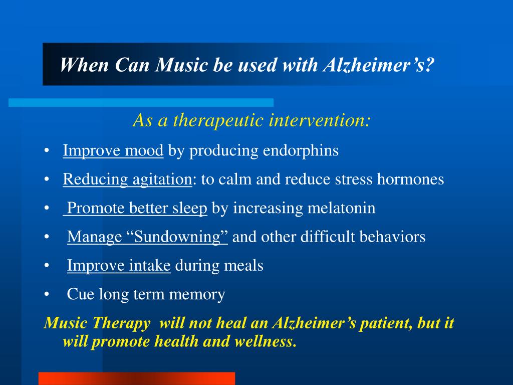 When Can Music be used with Alzheimer’s? As a therapeutic intervention: • Improve mood by producing endorphins • Reducing agitation: to calm and reduce stress hormones • Promote better sleep by increasing melatonin • Manage “Sundowning” and other difficult behaviors • Improve intake during meals • Cue long term memory Music Therapy will not heal an Alzheimer’s patient, but it will promote health and wellness.