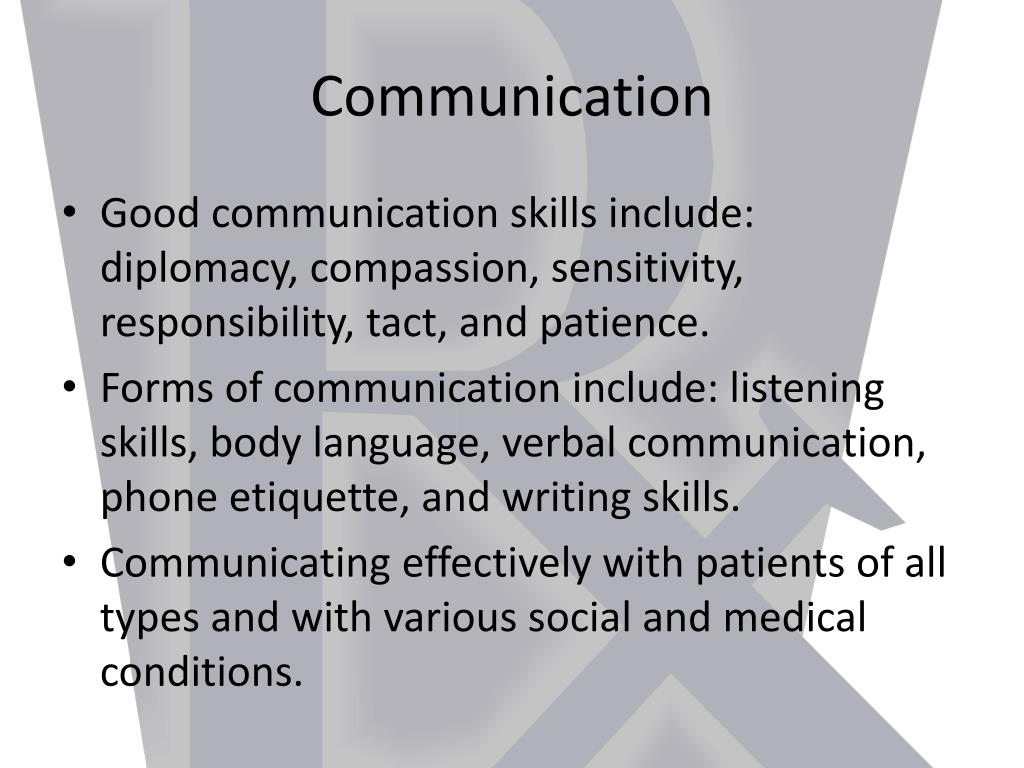 Communication • Good communication skills include: diplomacy, compassion, sensitivity, responsibility, tact, and patience. • Forms of communication include: listening skills, body language, verbal communication, phone etiquette, and writing skills. • Communicating effectively with patients of all types and with various social and medical conditions.