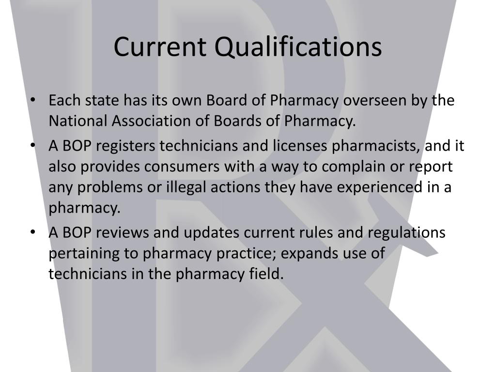 Current Qualifications • Each state has its own Board of Pharmacy overseen by the National Association of Boards of Pharmacy. • A BOP registers technicians and licenses pharmacists, and it also provides consumers with a way to complain or report any problems or illegal actions they have experienced in a pharmacy. • A BOP reviews and updates current rules and regulations pertaining to pharmacy practice; expands use of technicians in the pharmacy field.