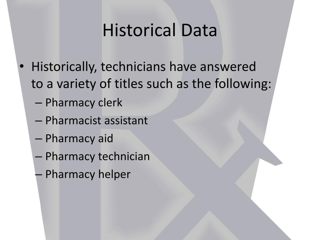 Historical Data • Historically, technicians have answered to a variety of titles such as the following: • Pharmacy clerk • Pharmacist assistant • Pharmacy aid • Pharmacy technician • Pharmacy helper