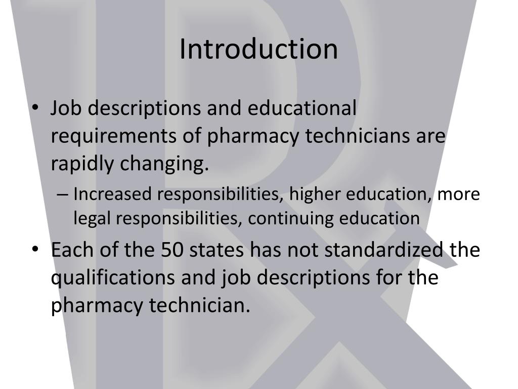 Introduction • Job descriptions and educational requirements of pharmacy technicians are rapidly changing. • Increased responsibilities, higher education, more legal responsibilities, continuing education • Each of the 50 states has not standardized the qualifications and job descriptions for the pharmacy technician.