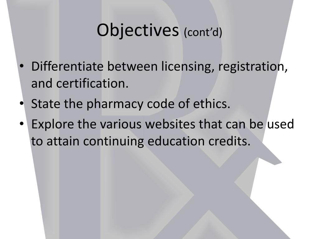 Objectives (cont’d) • Differentiate between licensing, registration, and certification. • State the pharmacy code of ethics. • Explore the various websites that can be used to attain continuing education credits.