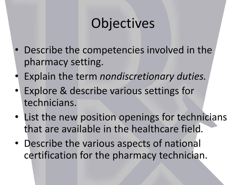 Pharmacy Ethics, Competencies, Associations, and Settings for Technicians. Chapter 3. Objectives. Describe the competencies involved in the pharmacy setting. Explain the term nondiscretionary duties. Explore & describe various settings for technicians .