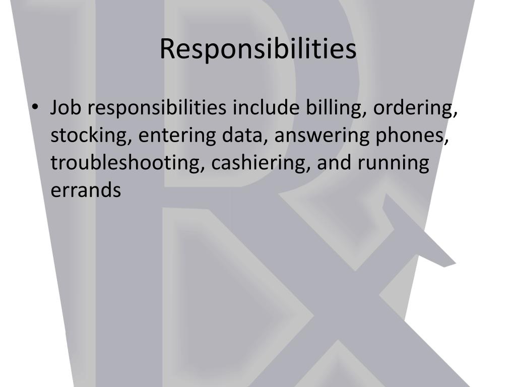 Responsibilities • Job responsibilities include billing, ordering, stocking, entering data, answering phones, troubleshooting, cashiering, and running errands