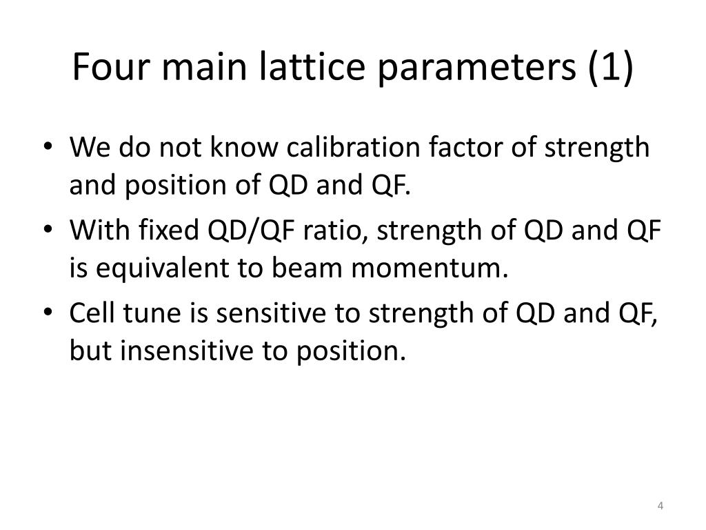 Four main lattice parameters (1) • We do not know calibration factor of strength and position of QD and QF. • With fixed QD/QF ratio, strength of QD and QF is equivalent to beam momentum. • Cell tune is sensitive to strength of QD and QF, but insensitive to position.