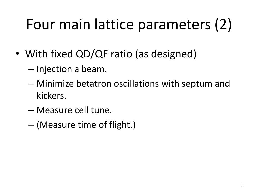 Four main lattice parameters (2) • With fixed QD/QF ratio (as designed) • Injection a beam. • Minimize betatron oscillations with septum and kickers. • Measure cell tune. • (Measure time of flight.)