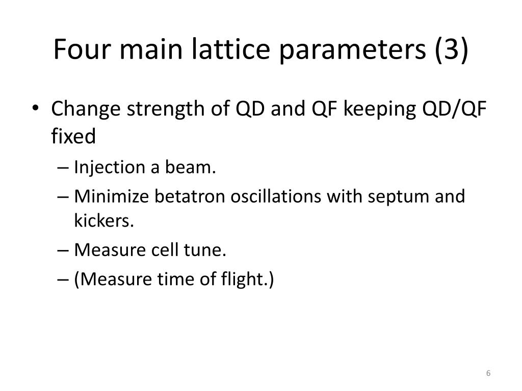 Four main lattice parameters (3) • Change strength of QD and QF keeping QD/QF fixed • Injection a beam. • Minimize betatron oscillations with septum and kickers. • Measure cell tune. • (Measure time of flight.)