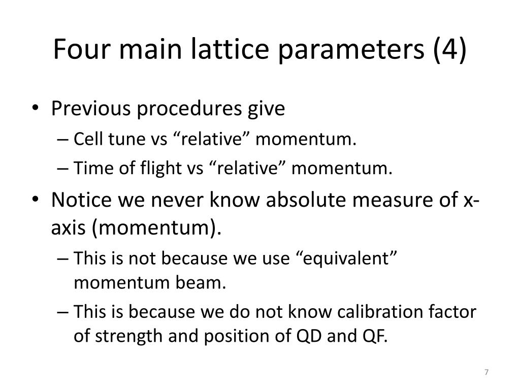 Four main lattice parameters (4) • Previous procedures give • Cell tune vs “relative” momentum. • Time of flight vs “relative” momentum. • Notice we never know absolute measure of x-axis (momentum). • This is not because we use “equivalent” momentum beam. • This is because we do not know calibration factor of strength and position of QD and QF.