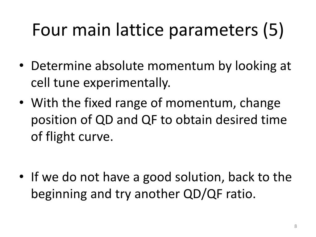 Four main lattice parameters (5) • Determine absolute momentum by looking at cell tune experimentally. • With the fixed range of momentum, change position of QD and QF to obtain desired time of flight curve. • If we do not have a good solution, back to the beginning and try another QD/QF ratio.