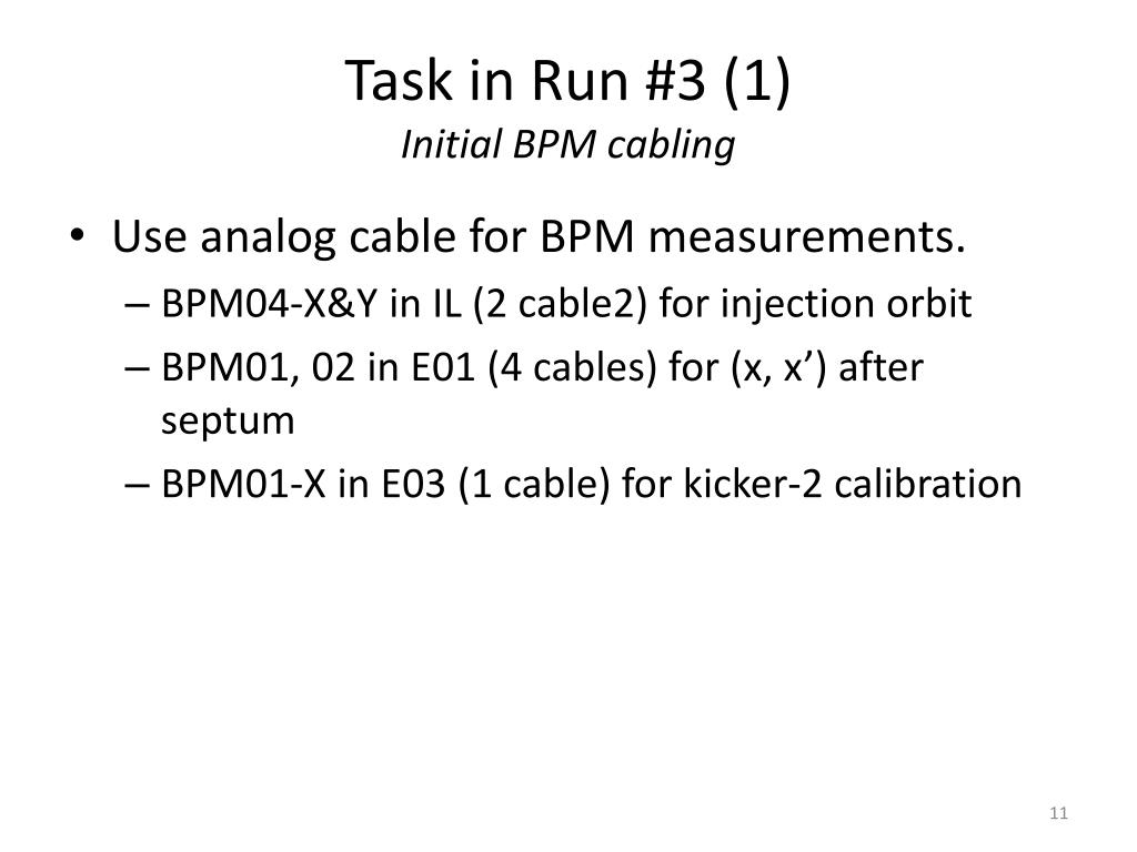 Task in Run #3 (1)Initial BPM cabling • Use analog cable for BPM measurements. • BPM04-X&Y in IL (2 cable2) for injection orbit • BPM01, 02 in E01 (4 cables) for (x, x’) after septum • BPM01-X in E03 (1 cable) for kicker-2 calibration