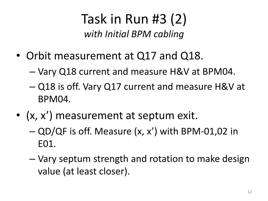 Task in Run #3 (2)with Initial BPM cabling • Orbit measurement at Q17 and Q18. • Vary Q18 current and measure H&V at BPM04. • Q18 is off. Vary Q17 current and measure H&V at BPM04. • (x, x’) measurement at septum exit. • QD/QF is off. Measure (x, x’) with BPM-01,02 in E01. • Vary septum strength and rotation to make design value (at least closer).