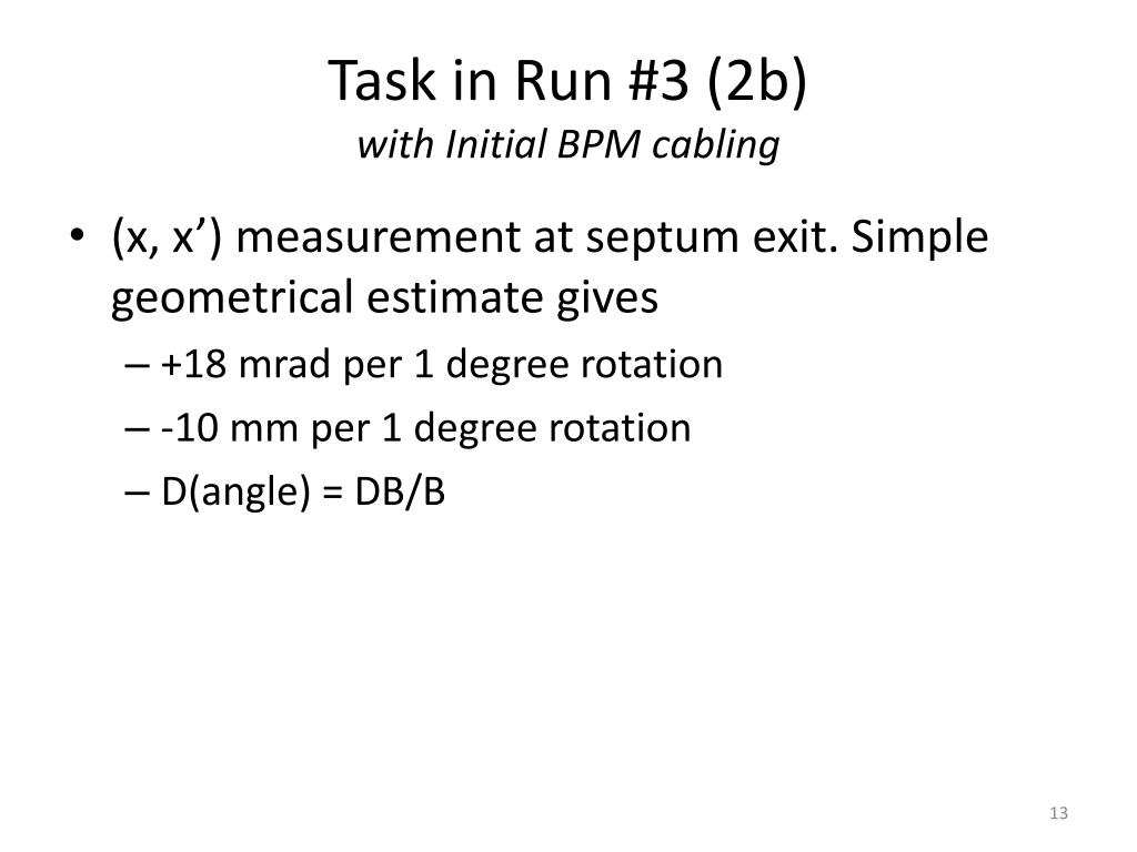 Task in Run #3 (2b)with Initial BPM cabling • (x, x’) measurement at septum exit. Simple geometrical estimate gives • +18 mrad per 1 degree rotation • -10 mm per 1 degree rotation • D(angle) = DB/B