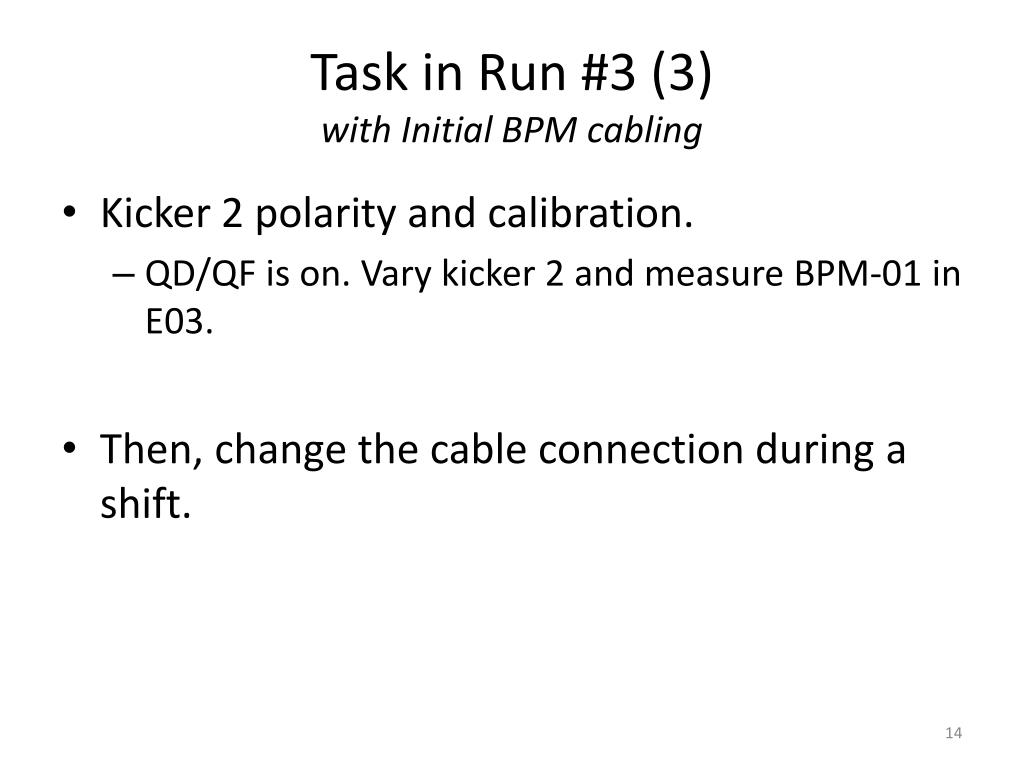 Task in Run #3 (3)with Initial BPM cabling • Kicker 2 polarity and calibration. • QD/QF is on. Vary kicker 2 and measure BPM-01 in E03. • Then, change the cable connection during a shift.
