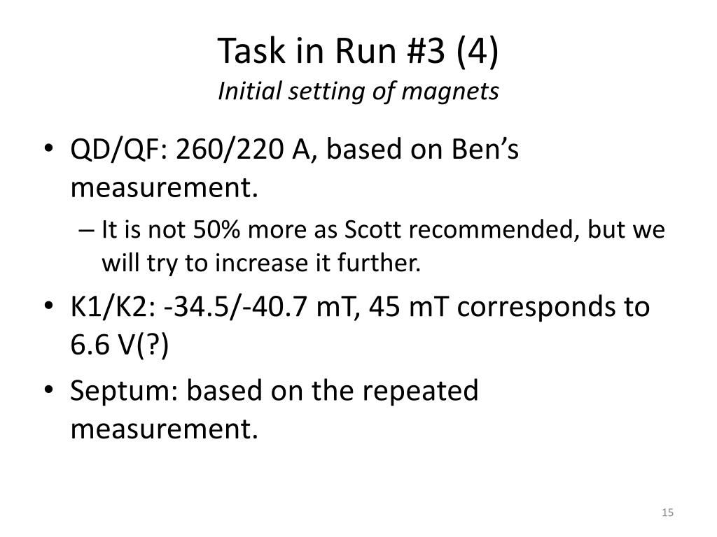 Task in Run #3 (4)Initial setting of magnets • QD/QF: 260/220 A, based on Ben’s measurement. • It is not 50% more as Scott recommended, but we will try to increase it further. • K1/K2: -34.5/-40.7 mT, 45 mT corresponds to 6.6 V(?) • Septum: based on the repeated measurement.