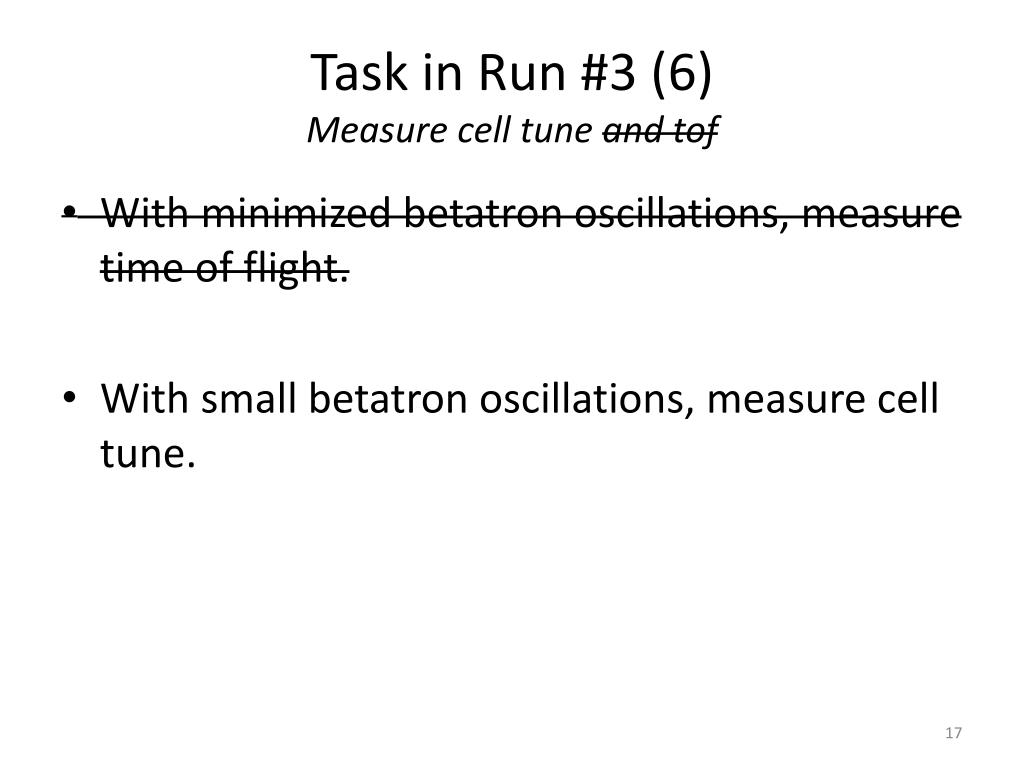 Task in Run #3 (6)Measure cell tune and tof • With minimized betatron oscillations, measure time of flight. • With small betatron oscillations, measure cell tune.
