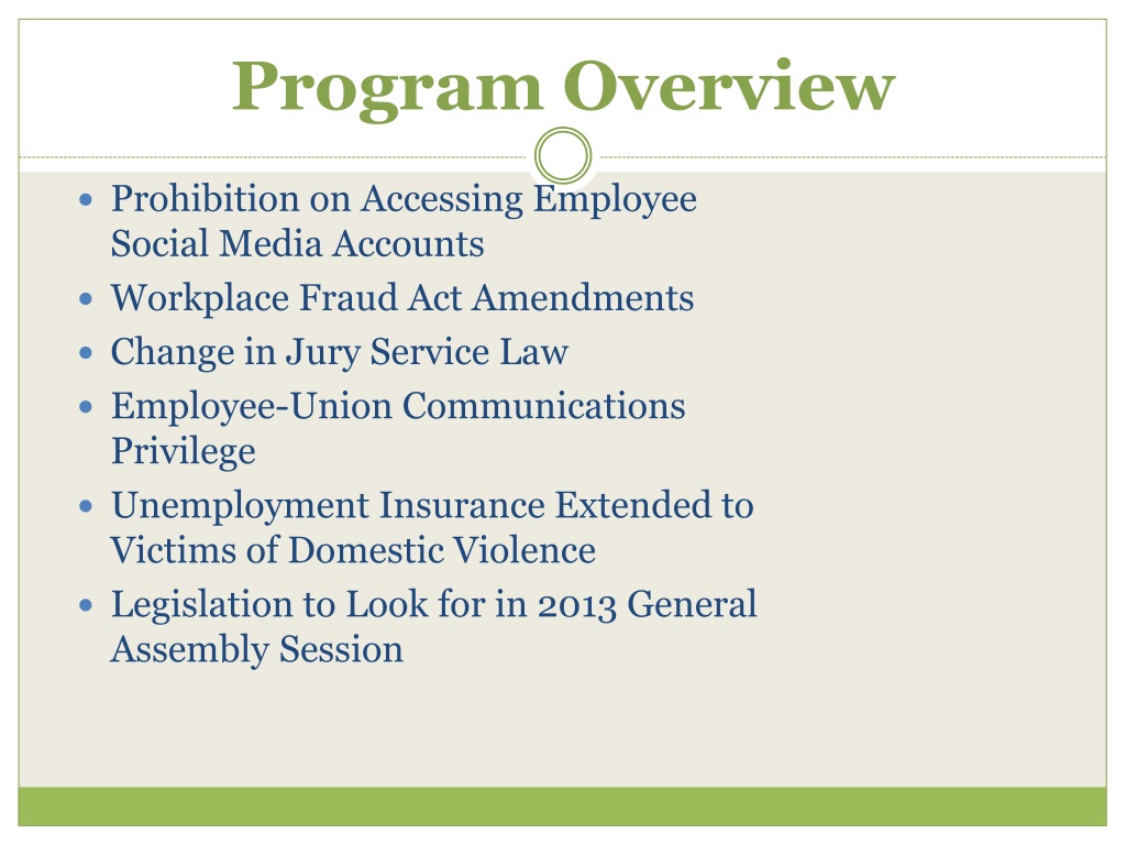 Program Overview • Prohibition on Accessing Employee Social Media Accounts • Workplace Fraud Act Amendments • Change in Jury Service Law • Employee-Union Communications Privilege • Unemployment Insurance Extended to Victims of Domestic Violence • Legislation to Look for in 2013 General Assembly Session
