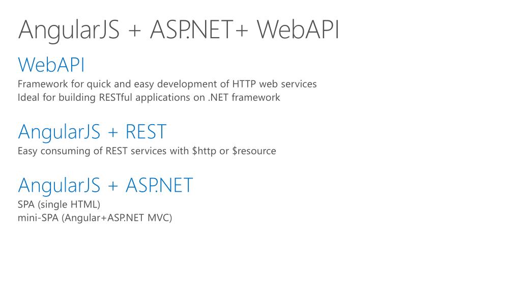 AngularJS + ASP.NET+ WebAPI • WebAPI • Framework for quick and easy development of HTTP web services • Ideal for building RESTful applications on .NET framework • AngularJS + REST • Easy consuming of REST services with $http or $resource • AngularJS + ASP.NET • SPA (single HTML) • mini-SPA (Angular+ASP.NET MVC)