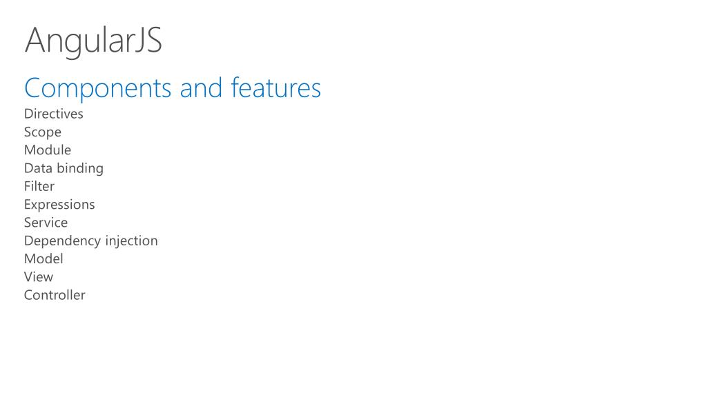 AngularJS • Components and features • Directives • Scope • Module • Data binding • Filter • Expressions • Service • Dependency injection • Model • View • Controller