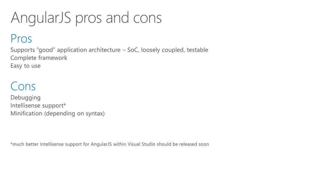 AngularJS pros and cons • Pros • Supports “good” application architecture – SoC, loosely coupled, testable • Complete framework • Easy to use • Cons • Debugging • Intellisense support* • Minification (depending on syntax) • *much better Intellisense support for AngularJS within Visual Studio should be released soon