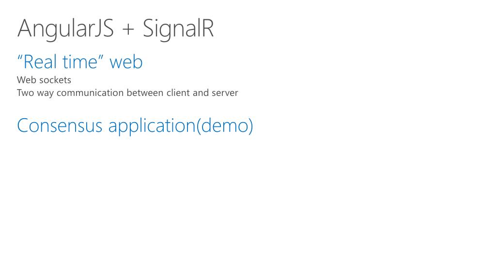 AngularJS + SignalR • “Real time” web • Web sockets • Two way communication between client and server • Consensus application(demo)