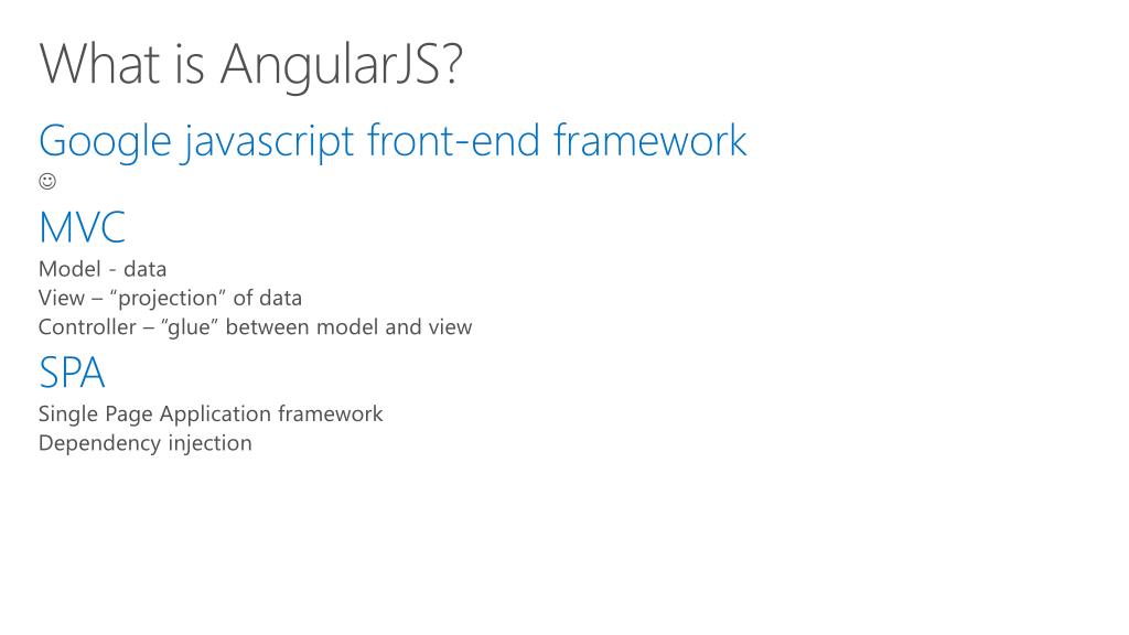 What is AngularJS? • Google javascript front-end framework • • MVC • Model - data • View – “projection” of data • Controller – “glue” between model and view • SPA • Single Page Application framework • Dependency injection