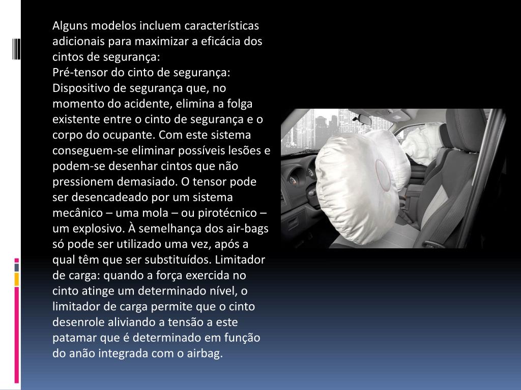 Mecanismos de segurança nos carros: • Quando se fala em mecanismos de segurança nos carros, o cinto de segurança ainda é a imagem mais lembrada. Mas fabricantes de veículos desenvolvem soluções de alta tecnologia, como computadores e sensores, para evitar acidentes.