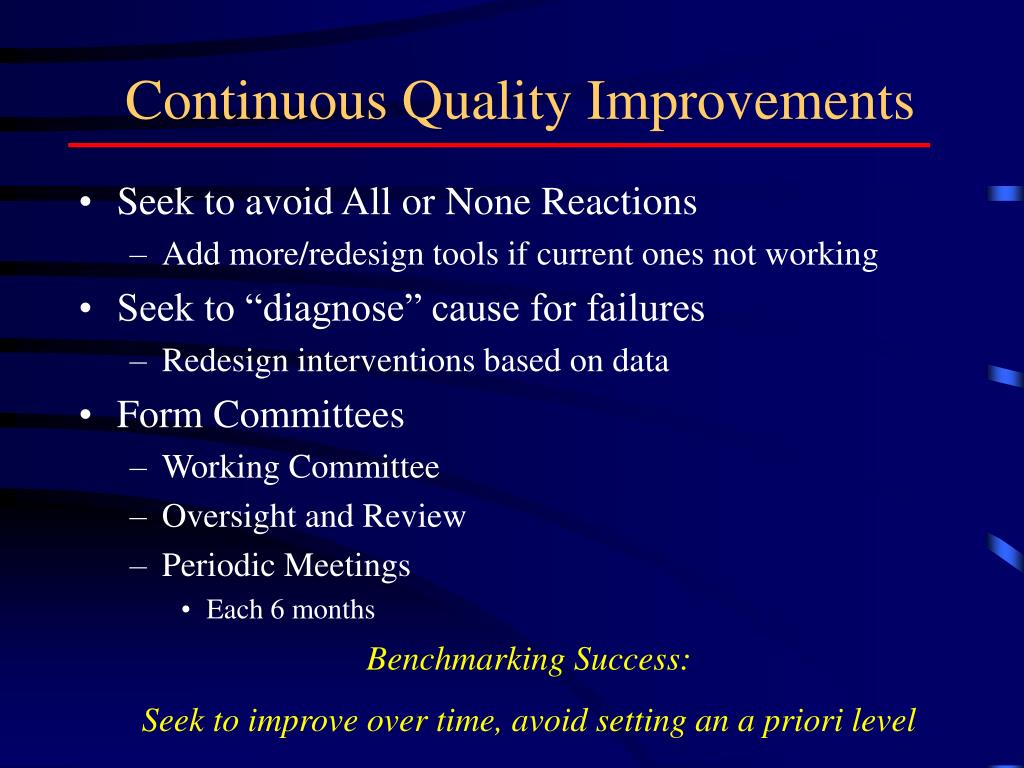 Continuous Quality Improvements • Seek to avoid All or None Reactions • Add more/redesign tools if current ones not working • Seek to “diagnose” cause for failures • Redesign interventions based on data • Form Committees • Working Committee • Oversight and Review • Periodic Meetings • Each 6 months Benchmarking Success: Seek to improve over time, avoid setting an a priori level