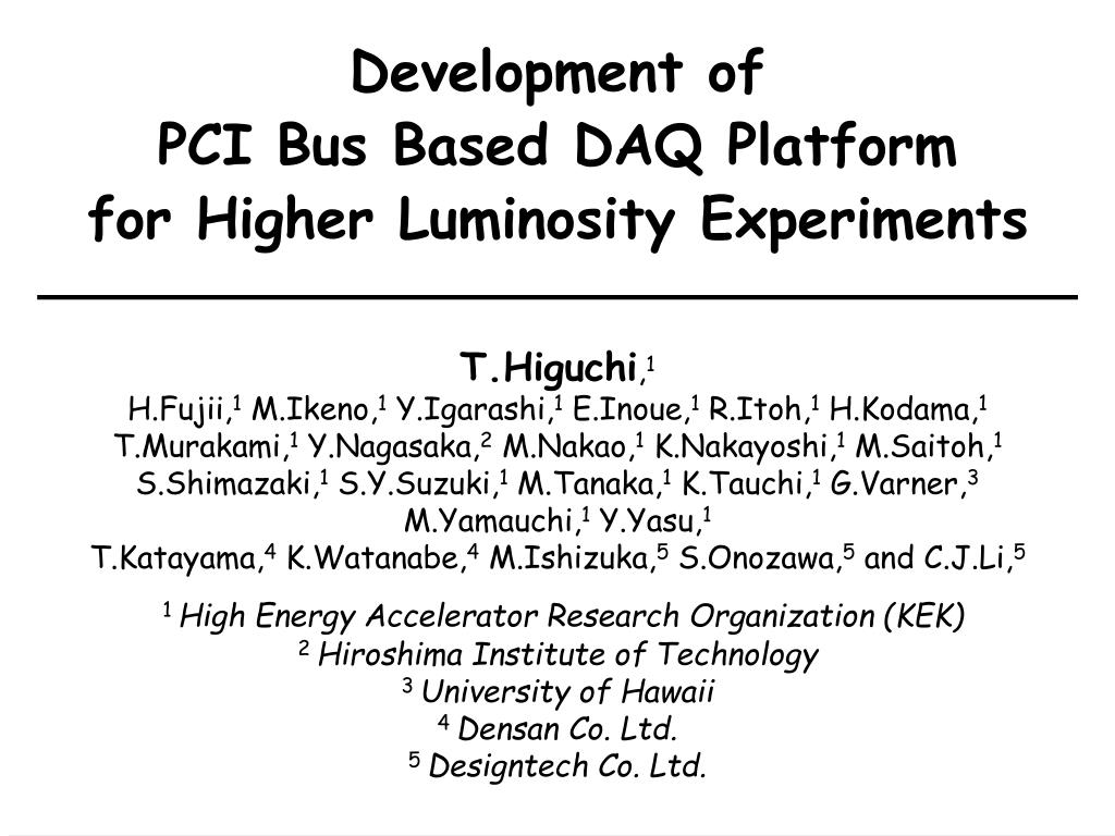 Development ofPCI Bus Based DAQ Platformfor Higher Luminosity Experiments T.Higuchi,1 H.Fujii,1 M.Ikeno,1 Y.Igarashi,1 E.Inoue,1 R.Itoh,1 H.Kodama,1 T.Murakami,1 Y.Nagasaka,2 M.Nakao,1 K.Nakayoshi,1 M.Saitoh,1 S.Shimazaki,1 S.Y.Suzuki,1 M.Tanaka,1 K.Tauchi,1 G.Varner,3 M.Yamauchi,1 Y.Yasu,1 T.Katayama,4 K.Watanabe,4 M.Ishizuka,5 S.Onozawa,5 and C.J.Li,5 1 High Energy Accelerator Research Organization (KEK) 2 Hiroshima Institute of Technology 3 University of Hawaii 4 Densan Co. Ltd. 5 Designtech Co. Ltd.