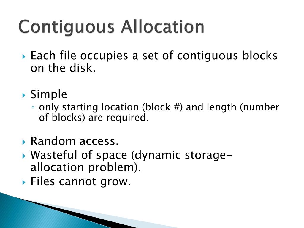 Contiguous Allocation • Each file occupies a set of contiguous blocks on the disk. • Simple • only starting location (block #) and length (number of blocks) are required. • Random access. • Wasteful of space (dynamic storage-allocation problem). • Files cannot grow.