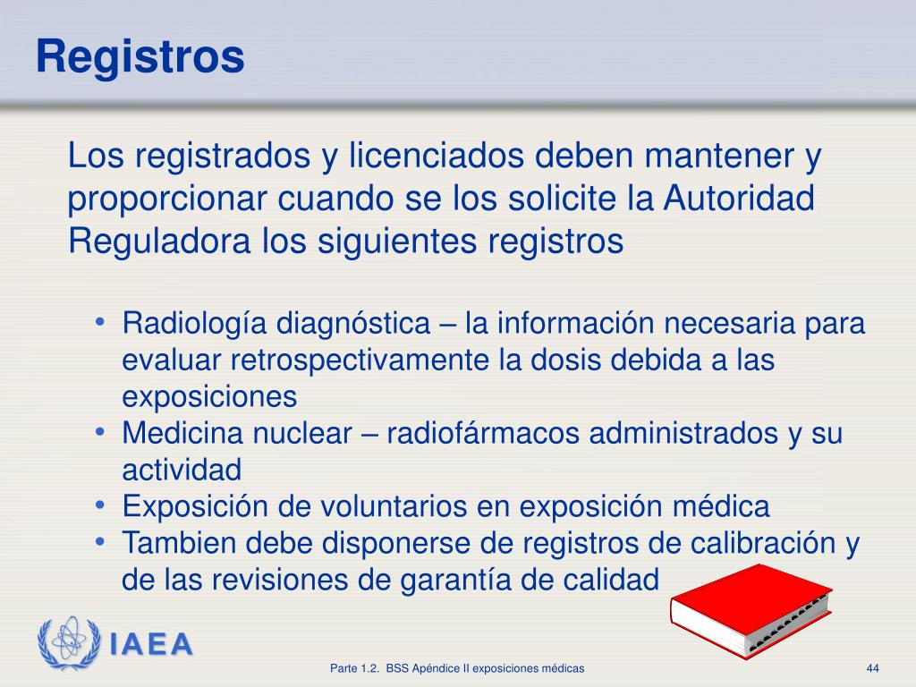 Registros Los registrados y licenciados deben mantener y proporcionar cuando se los solicite la Autoridad Reguladora los siguientes registros • Radiología diagnóstica – la información necesaria para evaluar retrospectivamente la dosis debida a las exposiciones • Medicina nuclear – radiofármacos administrados y su actividad • Exposición de voluntarios en exposición médica • Tambien debe disponerse de registros de calibración y de las revisiones de garantía de calidad