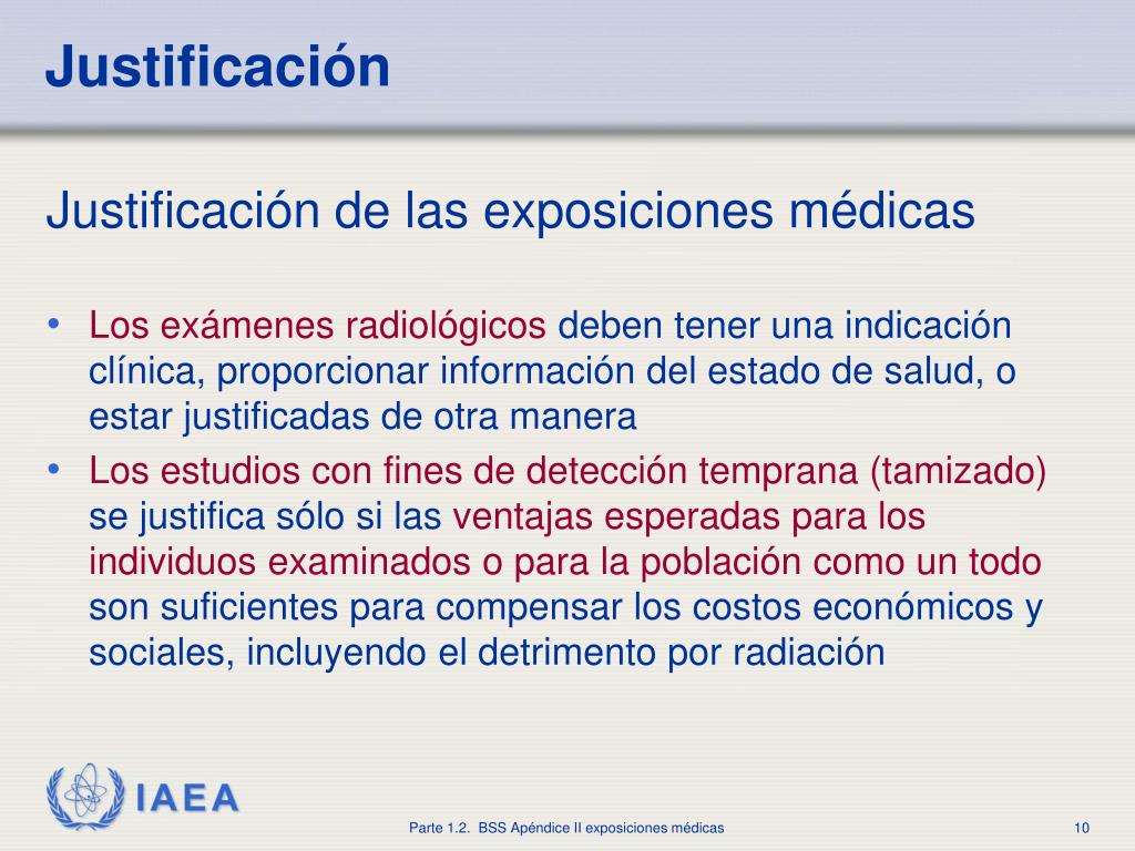 Justificación • Justificación de las exposiciones médicas • Los exámenes radiológicosdeben tener una indicación clínica, proporcionar información del estado de salud, o estar justificadas de otra manera • Los estudios con fines de detección temprana (tamizado)se justifica sólo si lasventajas esperadas para los individuos examinados o para la población como un todoson suficientes para compensar los costos económicos y sociales, incluyendo el detrimento por radiación