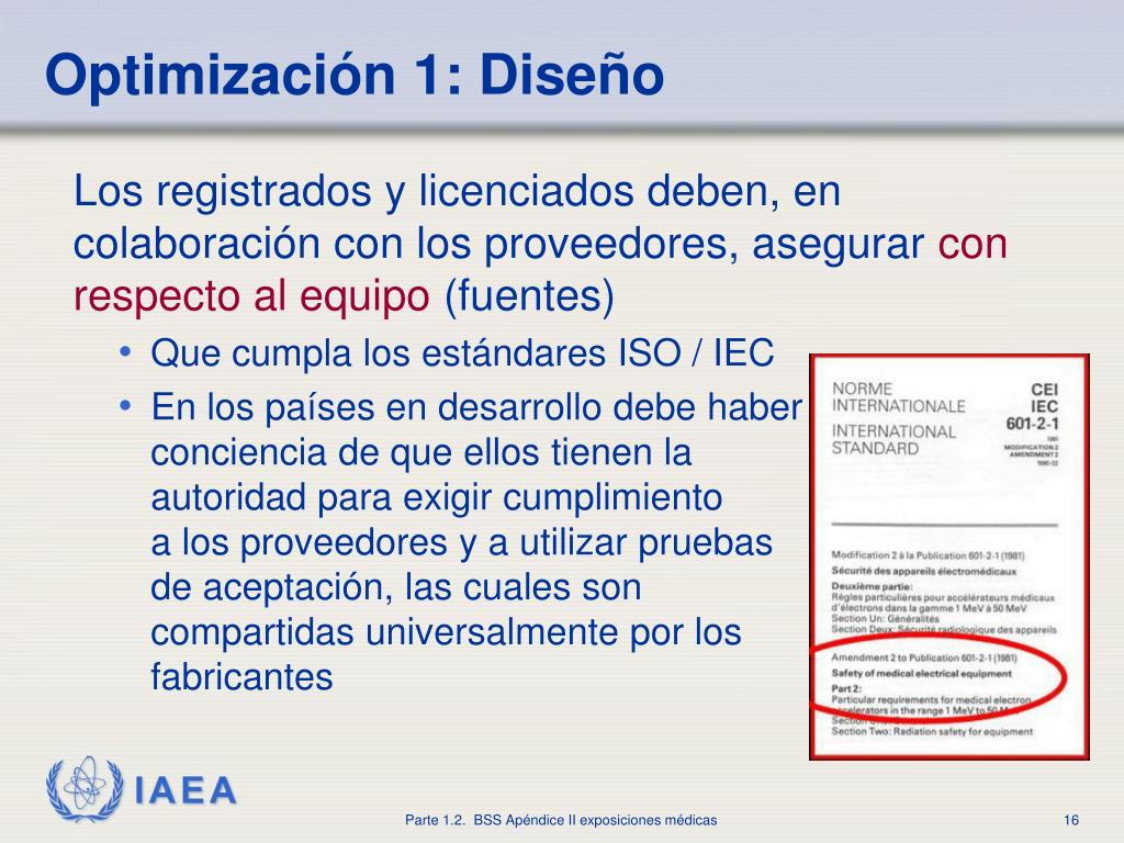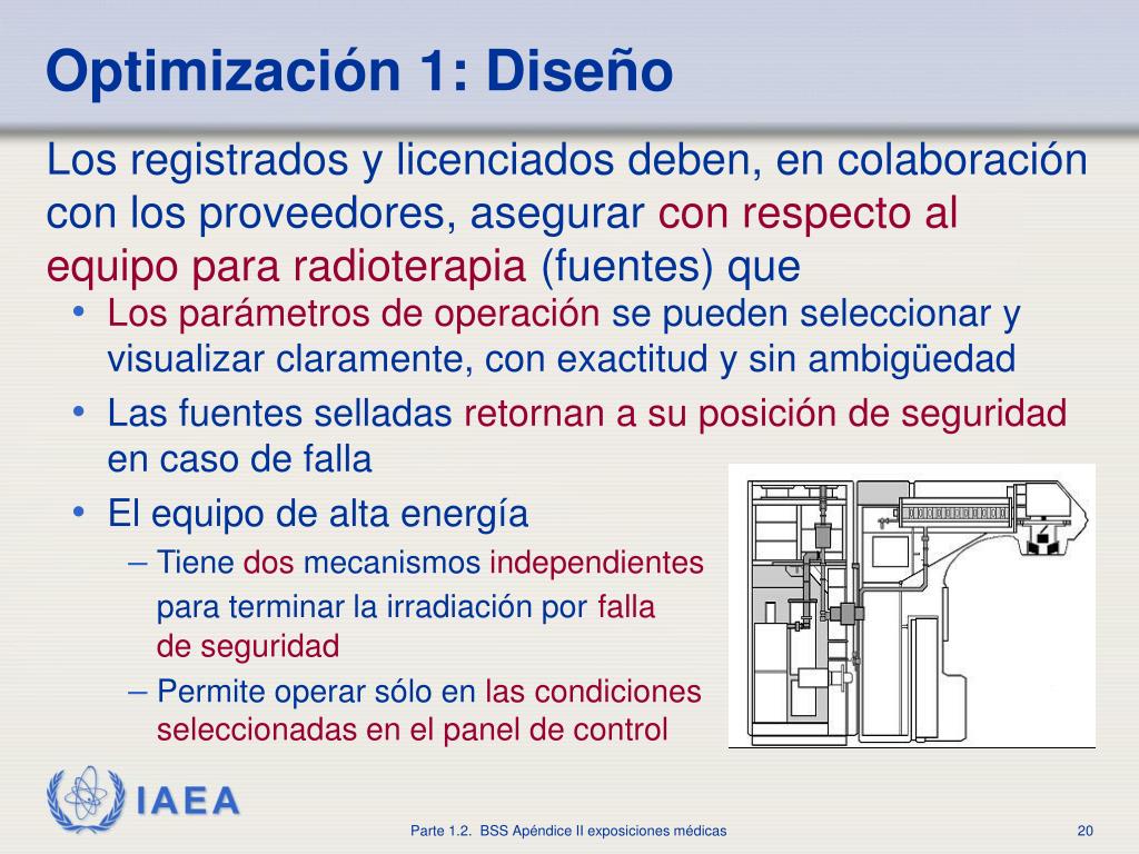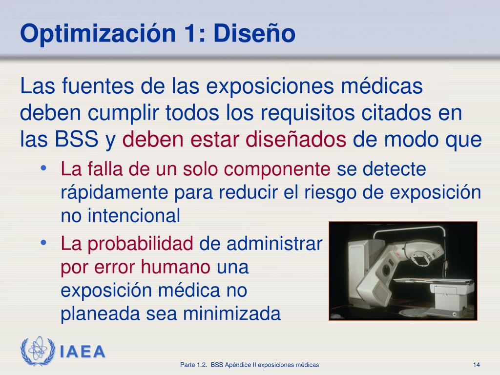 Optimización1: Diseño • Las fuentes de las exposiciones médicas deben cumplir todos los requisitos citados en las BSS ydeben estar diseñadosde modo que • La falla de un solo componentese detecte rápidamente para reducir el riesgo de exposición no intencional • La probabilidadde administrarpor error humanounaexposición médica noplaneada sea minimizada