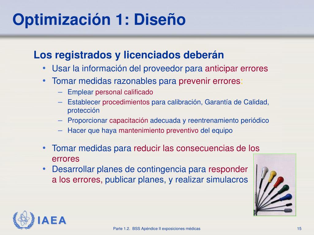 Optimización1: Diseño • Los registrados y licenciados deberán • Usar la información del proveedor paraanticipar errores • Tomar medidas razonables paraprevenir errores: • Emplearpersonal calificado • Establecer procedimientospara calibración, Garantía de Calidad, protección • Proporcionarcapacitaciónadecuada y reentrenamiento periódico • Hacer que hayamantenimiento preventivodel equipo • Tomar medidas parareducir las consecuencias de los errores • Desarrollar planes de contingencia pararespondera los errores,publicar planes, y realizar simulacros