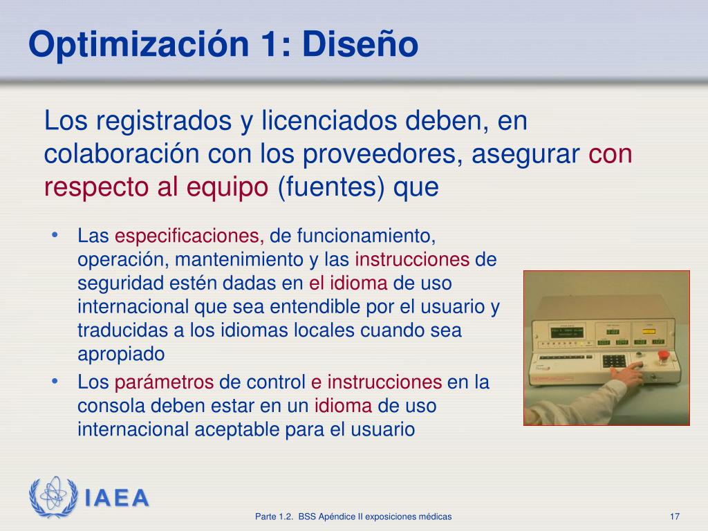 Optimización1: Diseño Los registrados y licenciados deben, en colaboración con los proveedores, asegurarcon respecto al equipo(fuentes) que • Lasespecificaciones,de funcionamiento, operación, mantenimiento y lasinstruccionesde seguridad estén dadas enel idiomade uso internacional que sea entendible por el usuario y traducidas a los idiomas locales cuando sea apropiado • Losparámetrosde controle instruccionesen la consola deben estar en unidiomade uso internacional aceptable para el usuario