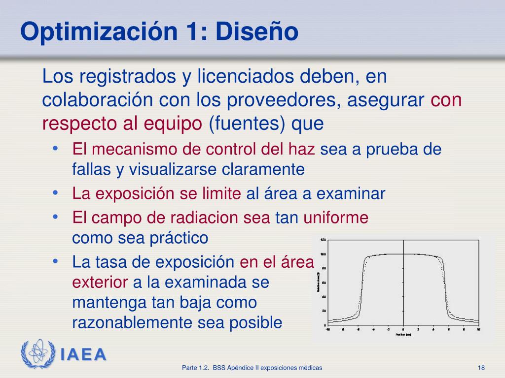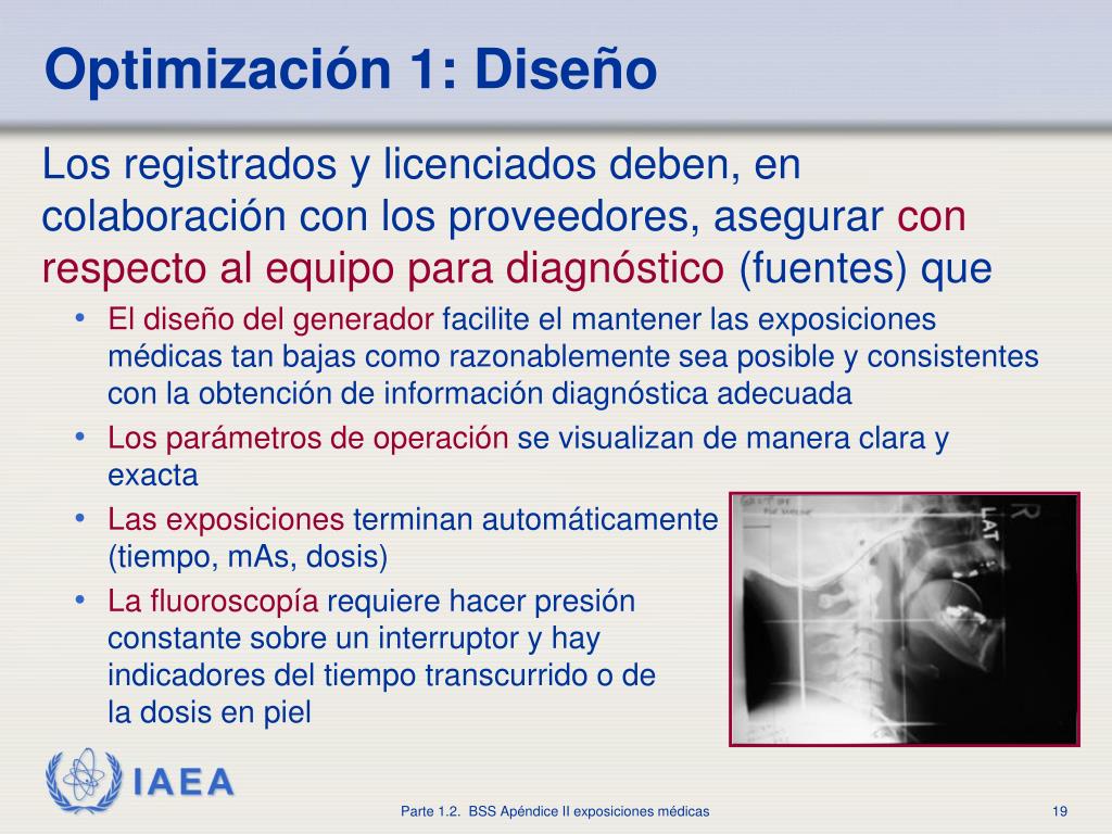 Optimización1: Diseño • Los registrados y licenciados deben, en colaboración con los proveedores, asegurarcon respecto al equipo(fuentes) que • El mecanismo de control del hazsea a prueba de fallas y visualizarse claramente • La exposición se limiteal área a examinar • El campo de radiacion seatanuniformecomo sea práctico • La tasa de exposiciónen el áreaexterior a la examinada semantenga tan baja comorazonablemente sea posible