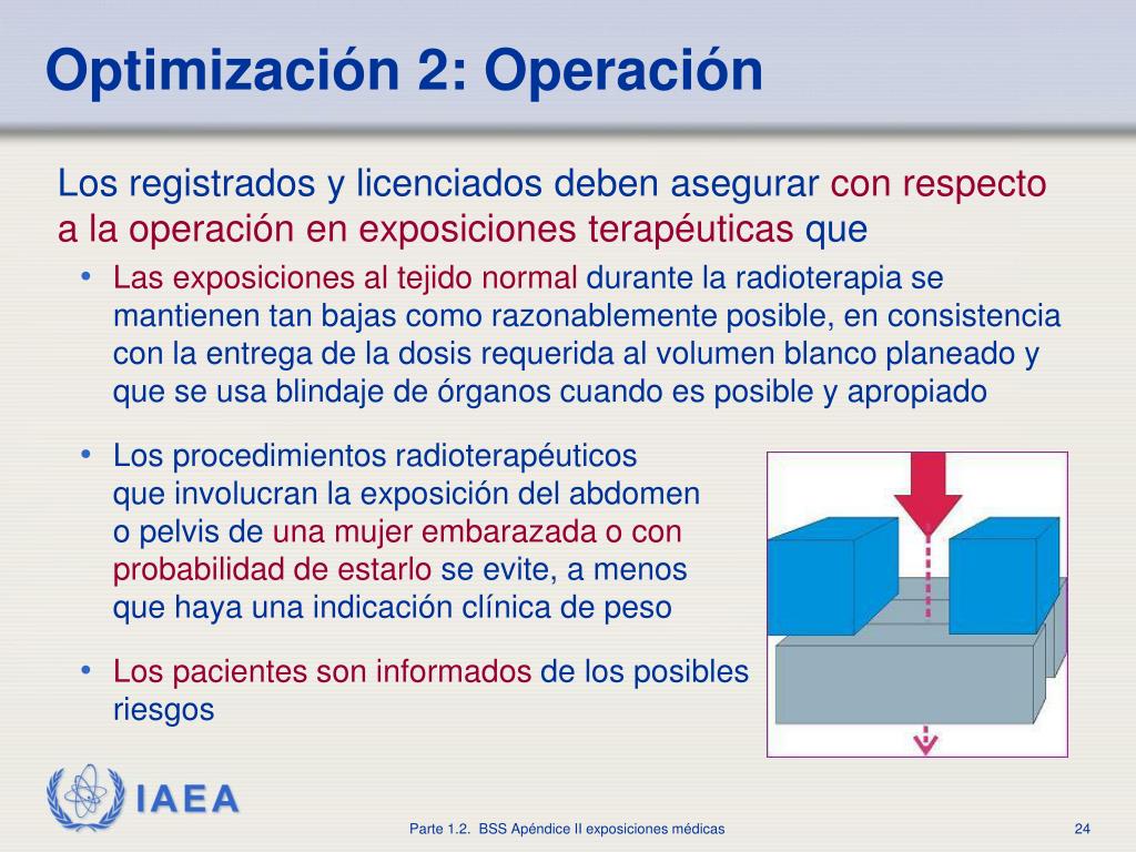 Optimización 2: Operación • Los registrados y licenciados deben asegurarcon respecto a la operación en exposiciones terapéuticasque • Las exposiciones al tejido normaldurante la radioterapia se mantienen tan bajas como razonablemente posible, en consistencia con la entrega de la dosis requerida al volumen blanco planeado y que se usa blindaje de órganos cuando es posible y apropiado • Los procedimientos radioterapéuticosque involucran la exposición del abdomeno pelvis deuna mujer embarazada o conprobabilidad de estarlose evite, a menos que haya una indicación clínica de peso • Los pacientes son informadosde los posiblesriesgos