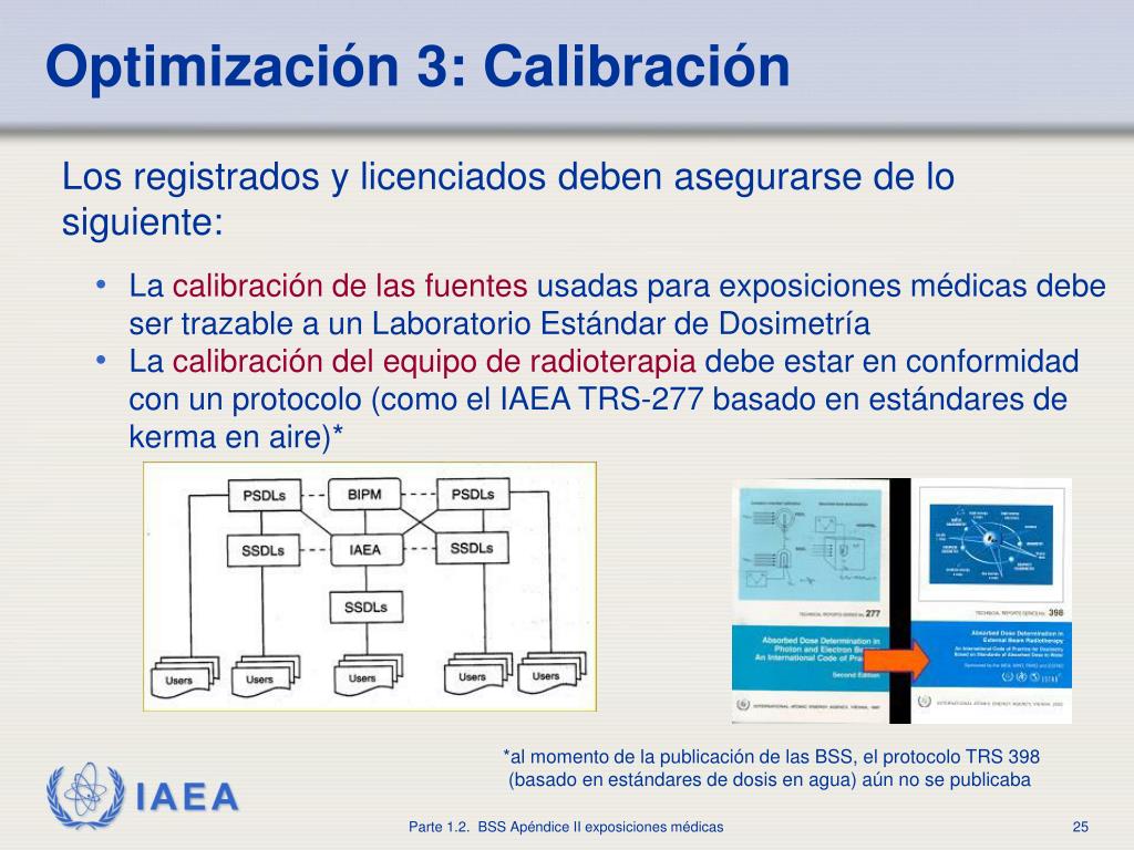 Optimización 3: Calibración • Los registrados y licenciados deben asegurarse de lo siguiente: • Lacalibración de las fuentesusadas para exposiciones médicas debe ser trazable a un Laboratorio Estándar de Dosimetría • Lacalibración del equipo de radioterapiadebe estar en conformidad con un protocolo (como el IAEA TRS-277 basado en estándares de kerma en aire)* *al momento de la publicación de las BSS, el protocolo TRS 398 (basado en estándares de dosis en agua) aún no se publicaba