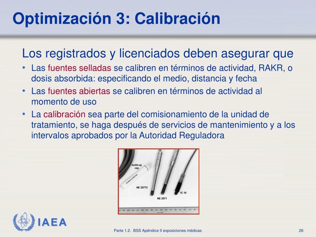 Optimización 3: Calibración • Los registrados y licenciados deben asegurar que • Lasfuentes selladasse calibren en términos de actividad, RAKR, o dosis absorbida: especificando el medio, distancia y fecha • Lasfuentes abiertasse calibren en términos de actividad al momento de uso • Lacalibraciónsea parte del comisionamiento de la unidad de tratamiento, se haga después de servicios de mantenimiento y a los intervalos aprobados por la Autoridad Reguladora