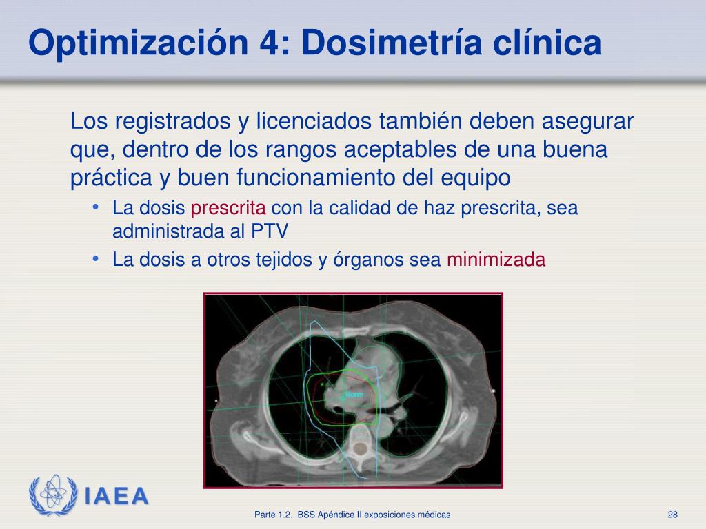 Optimización 4: Dosimetría clínica • Los registrados y licenciados deben asegurar que los siguientes puntos seandeterminadosydocumentados: • Exámenes radiológicos: valores representativos de dosis • Teleterapia: dosis máxima y mínima al PTV así como la dosis al punto relevante (centro) y a otros puntos considerados significativos • Braquiterapia: dosis absorbida a los puntos relevantes • Tratamiento con fuentes abiertas: dosis representativa • Todos los tratamientos de radioterapia: dosis a órganos relevantes
