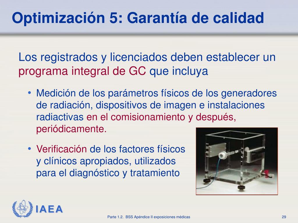 Optimización 5: Garantía de calidad • Los registrados y licenciados deben establecer unprograma integral de GCque incluya • Medición de los parámetros físicos de los generadores de radiación, dispositivos de imagen e instalaciones radiactivasen el comisionamiento y después, periódicamente. • Verificaciónde los factores físicosy clínicos apropiados, utilizadospara el diagnóstico y tratamiento