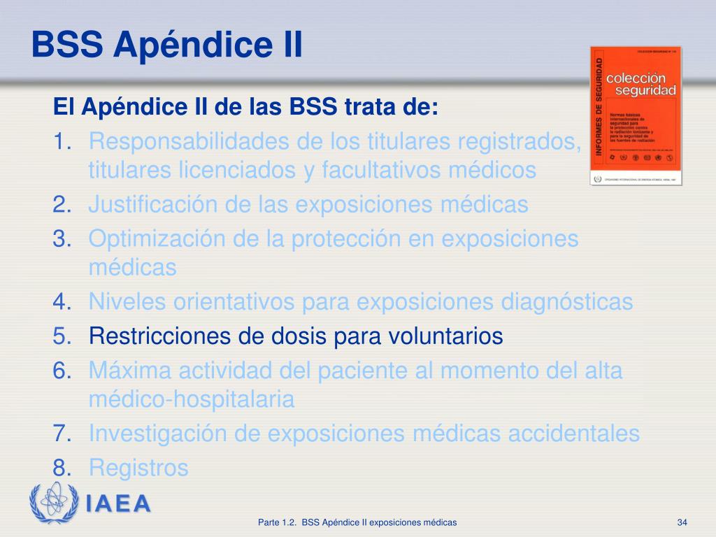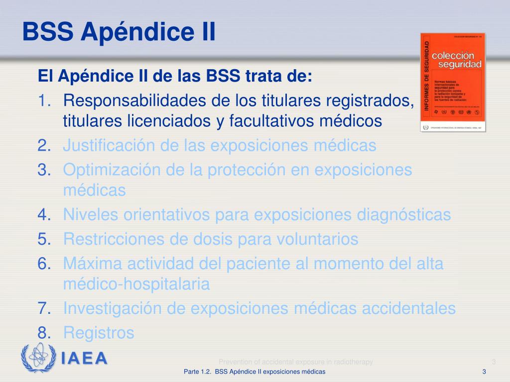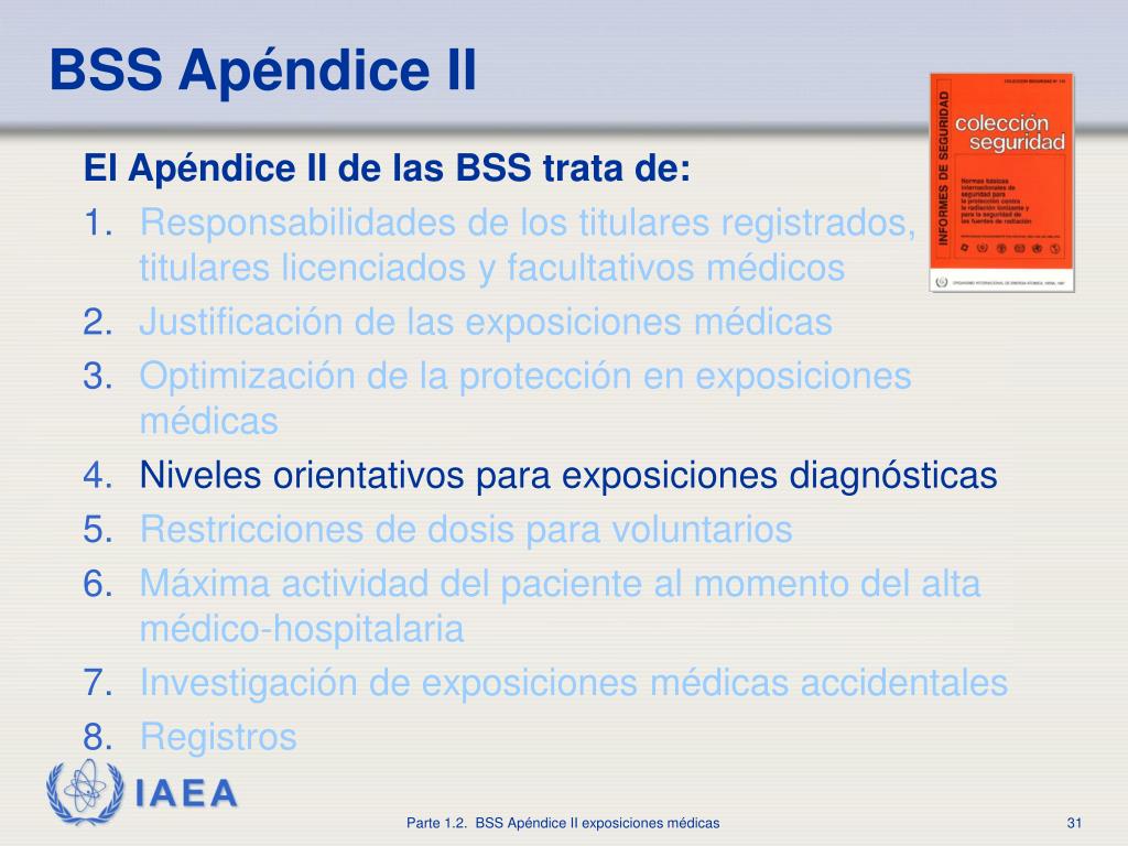 BSS Apéndice II El Apéndice II de las BSS trata de: • Responsabilidades de los titulares registrados, titulares licenciados y facultativos médicos • Justificación de las exposiciones médicas • Optimización de la protección en exposiciones médicas • Niveles orientativos para exposiciones diagnósticas • Restricciones de dosis para voluntarios • Máxima actividad del paciente al momento del alta médico-hospitalaria • Investigación de exposiciones médicas accidentales • Registros