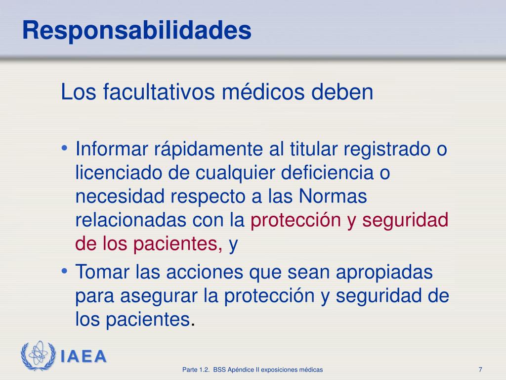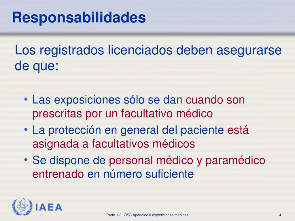 Responsabilidades • Los registrados licenciados deben asegurarse de que: • Las exposiciones sólo se dancuando son prescritas por un facultativo médico • La protección en general del pacienteestá asignada a facultativos médicos • Se dispone depersonal médico y paramédico entrenadoen número suficiente
