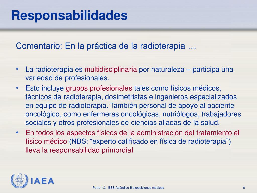 Responsabilidades • Comentario: En la práctica de la radioterapia … • La radioterapia esmultidisciplinariapor naturaleza – participa una variedad de profesionales. • Esto incluyegrupos profesionalestales como físicos médicos, técnicos de radioterapia, dosimetristas e ingenieros especializados en equipo de radioterapia. También personal de apoyo al paciente oncológico, como enfermeras oncológicas, nutriólogos, trabajadores sociales y otros profesionales de ciencias aliadas de la salud. • En todos los aspectos físicos de la administración del tratamiento el físico médico(NBS: “experto calificado en física de radioterapia”)lleva la responsabilidad primordial